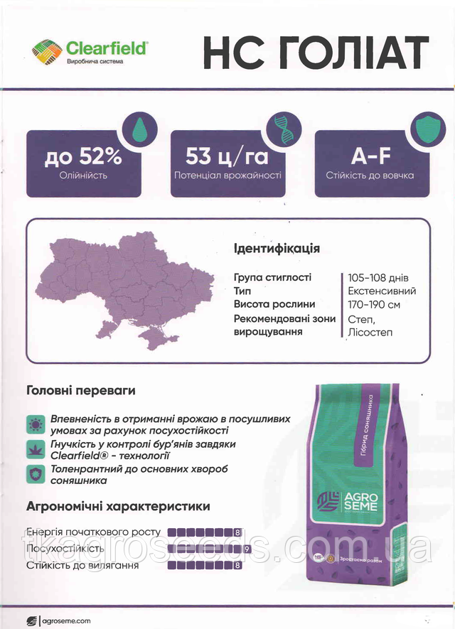 НС Голіат – якісний гібрид соняшнику, що належить до групи гібридів екстенсивного типу, має високий рівень врожайності, чудову стійкість до більшості негативних факторів впливу та непогані виробничі властивості. Рекомендований до вирощування у всіх придатних для даного різновиду рослинництва регіонах України.